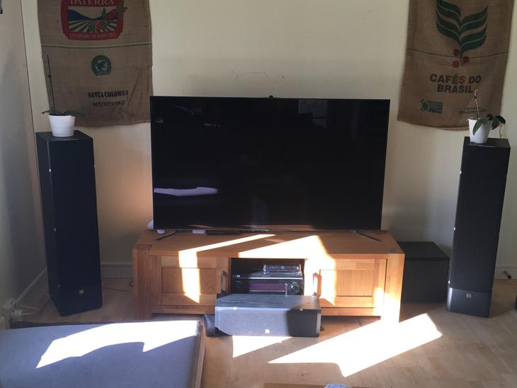 Planen er, at bagvæggen skal have en gang ny tapet, fjernsynet hænges på på væggen og centerhøjttaleren placeres ovenpå møblet. Men ting tager tid. Alt i alt er jeg rigtig godt tilfreds med både lyd og billede både hvad angår TV/film og musik. Der er godt med muskler til stereo qua effektforstærkeren.