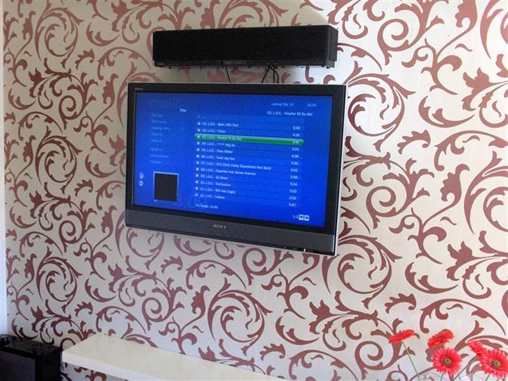 Tv og forstærker er sat på væggen hvor ledninger er spartlet ind og lagt specielt tapet over, så der er ikke nogen ledninger synlige, på nær lige mellem tv og forstærker dette vil dog blive bragt iorden snarest.