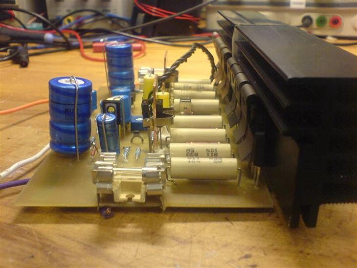 Strømfprsyningnen er opygget med fire diodebroer, to til hver +- forsyning, kodensatorerne i forsyningen er hver på 22000uF koblet i serie med toelrance modstande i parrelel.